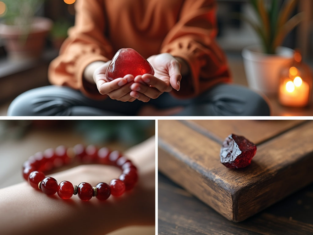 1. Tenez la pierre rouge (ex: Jaspe Rouge, Grenat) dans votre main ou placez-la près de la base de votre colonne vertébrale (chakra racine).