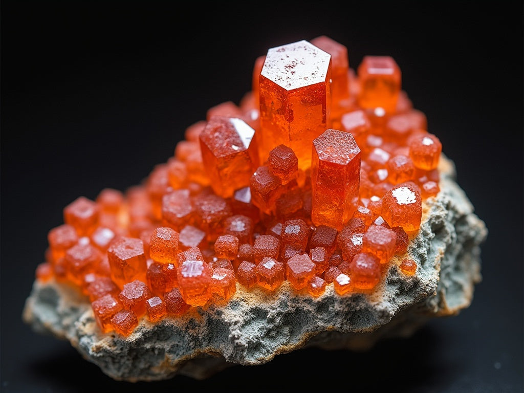 La vanadinite forme de superbes cristaux hexagonaux d'un rouge-orangé à rouge-brun éclatant. Elle est liée à l'endurance, à la discipline et à la connexion aux énergies terrestres. Elle aide à organiser ses pensées, à rester concentré sur ses objectifs et stimule la créativité. Attention : La vanadinite contient du plomb et du vanadium. Elle est toxique et doit être manipulée avec précaution (pas d'élixirs, lavage des mains après contact). Principalement utilisée pour la méditation à distance ou en vitrine.