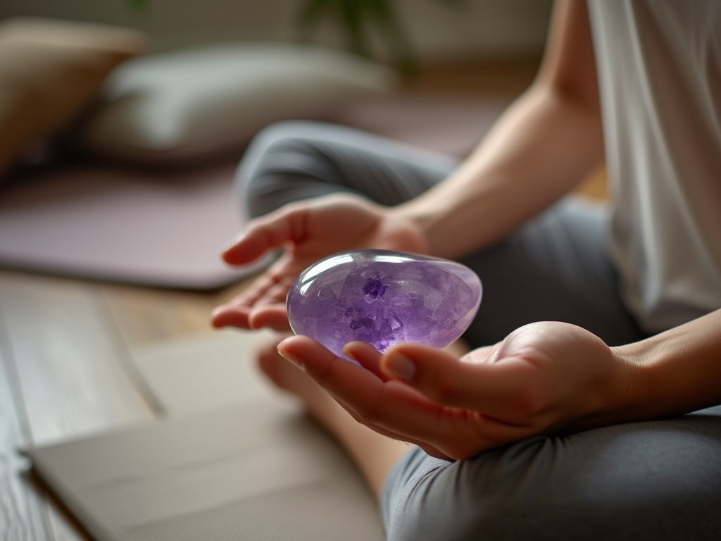 1. Tenez la pierre (ex: Améthyste) ou placez-la sur votre front (3e œil) ou le sommet de votre tête (couronne).