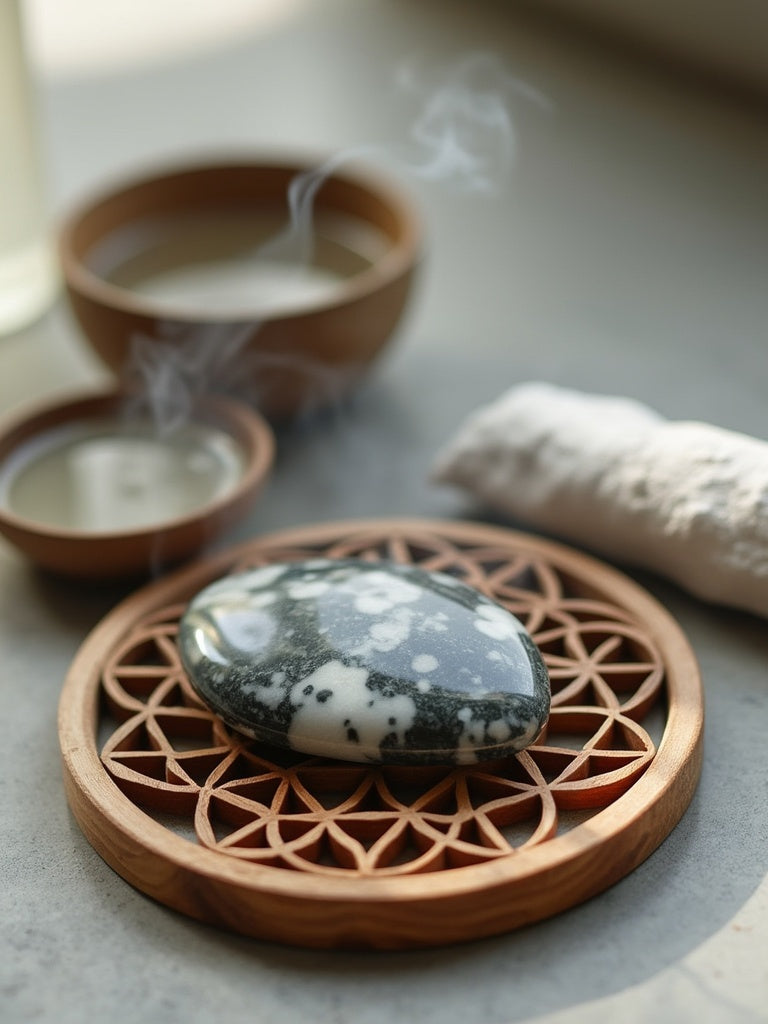 - Fleur de Vie : Déposez simplement votre pierre sur un support Fleur de Vie.