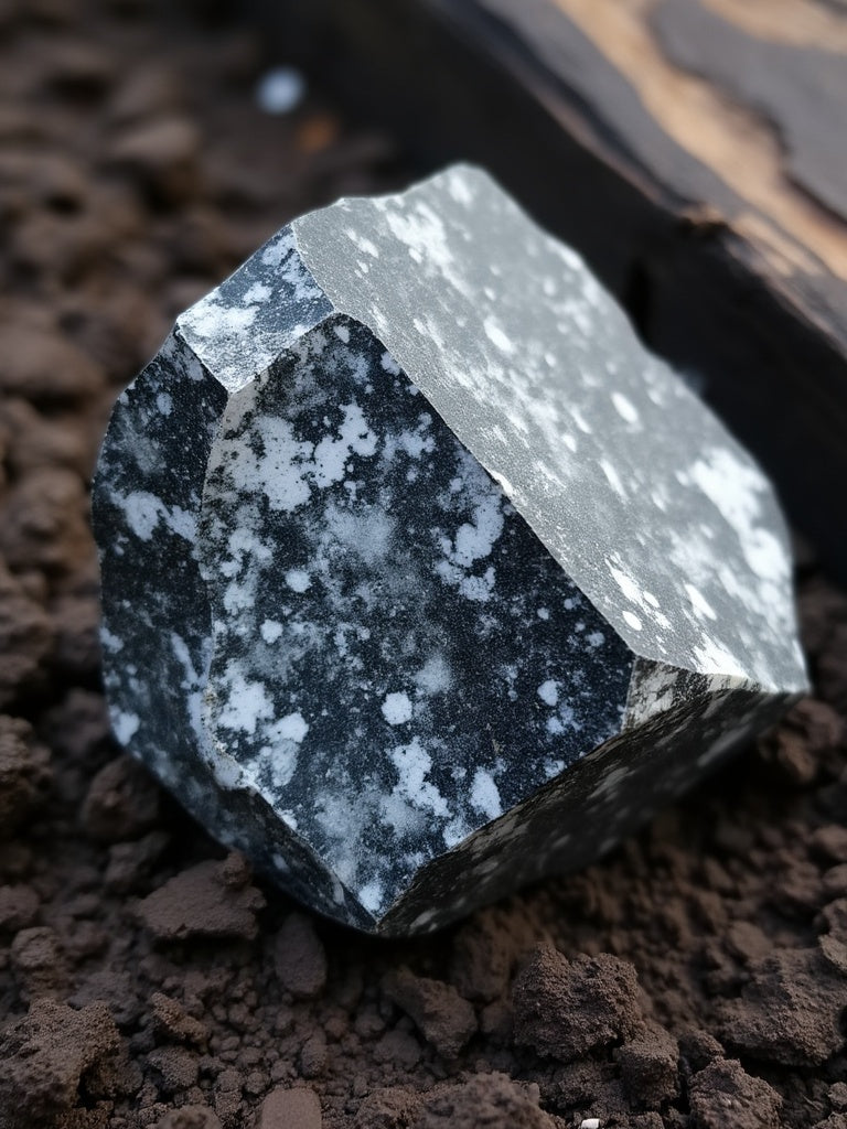Noir profond avec des inclusions blanches/grises (cristobalite) rappelant des flocons de neige