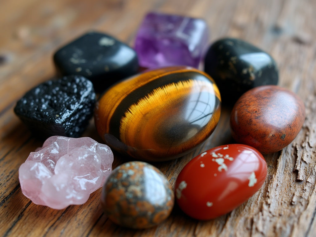 Tourmaline noire, Améthyste, Quartz rose, Jaspe rouge, Ambre