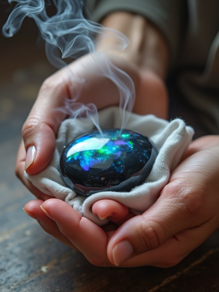 - ✅ Fumigation : La méthode la plus sûre. Passez délicatement votre Opale Noire dans la fumée de sauge blanche, de Palo Santo ou d'encens purificateur.