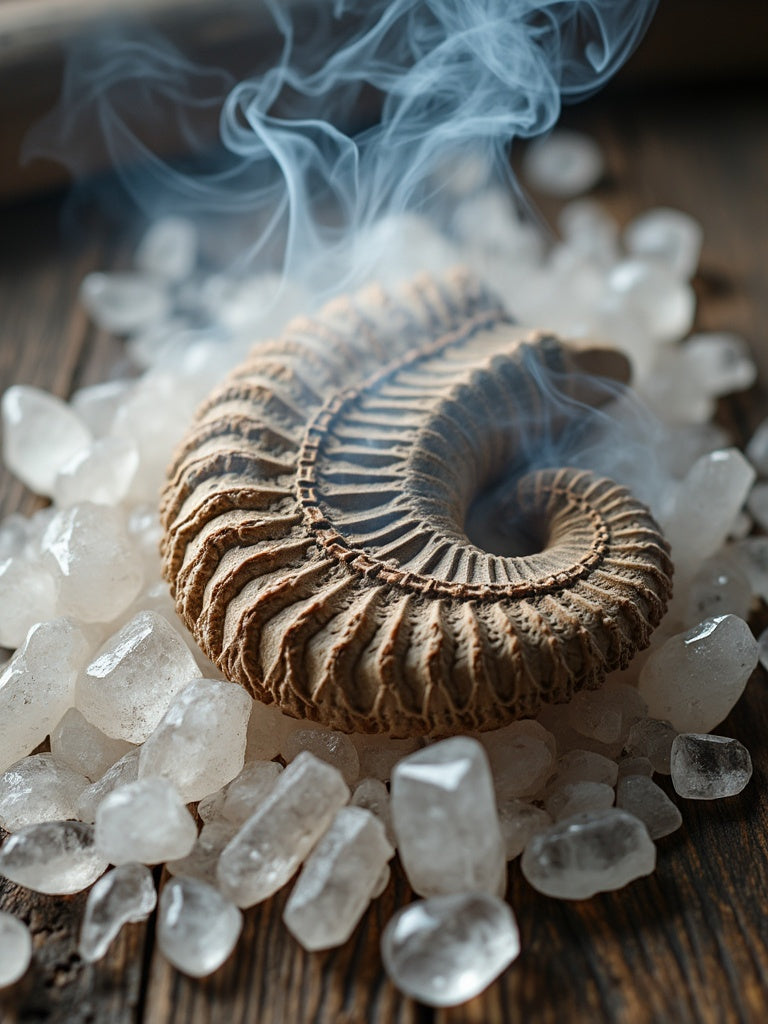 Imaginez la fumée de la sauge enveloppant votre Orthoceras, dissipant les énergies stagnantes. Visualisez-le ensuite posé sur un amas de quartz sous la douce lumière de la lune, se rechargeant d'une énergie stable et ancestrale.