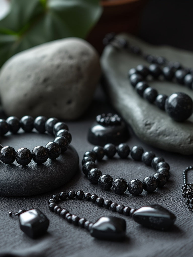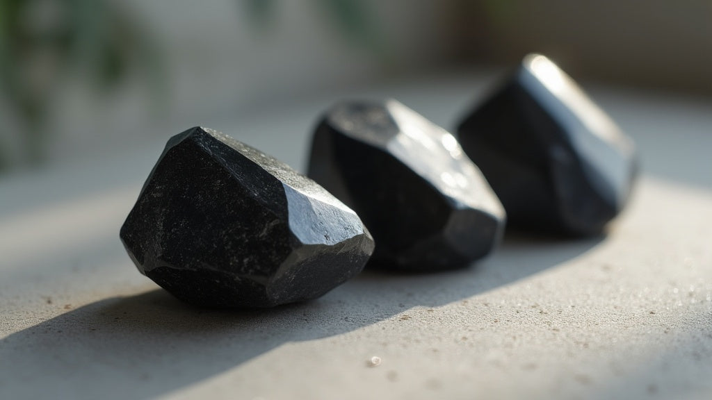 La shungite se présente sous différentes formes, allant du noir profond au gris argenté. Sa texture peut varier de lisse à rugueuse selon son grade. La shungite de grade I, la plus pure, contient jusqu'à 98% de carbone et est particulièrement recherchée pour ses propriétés énergétiques.