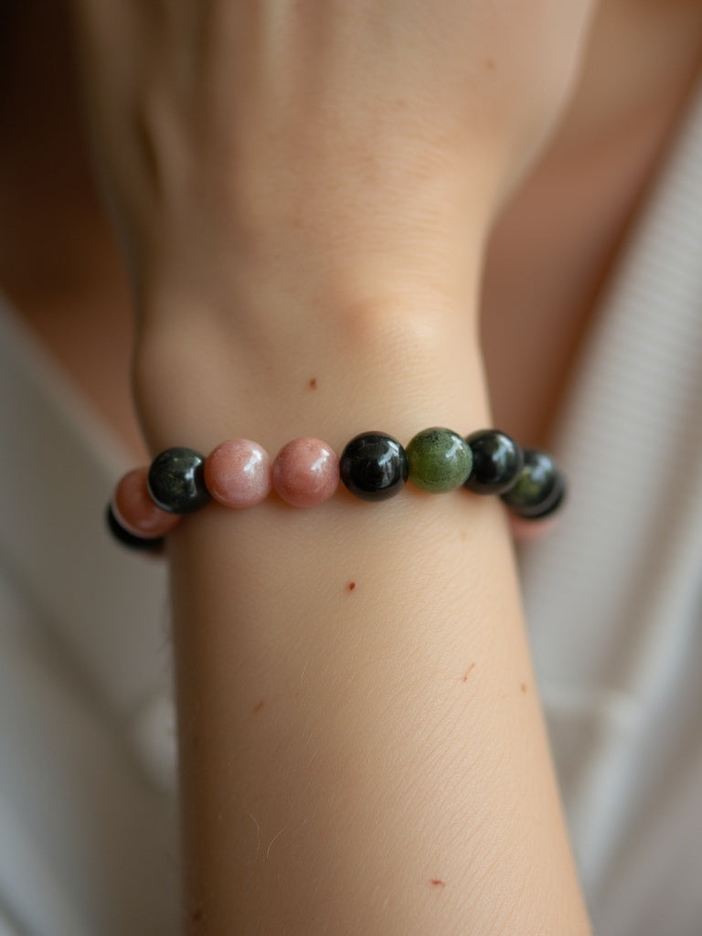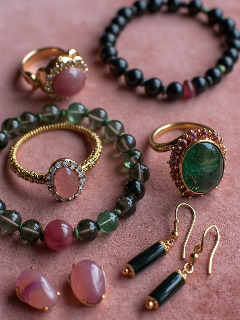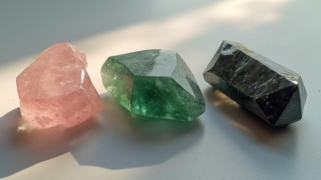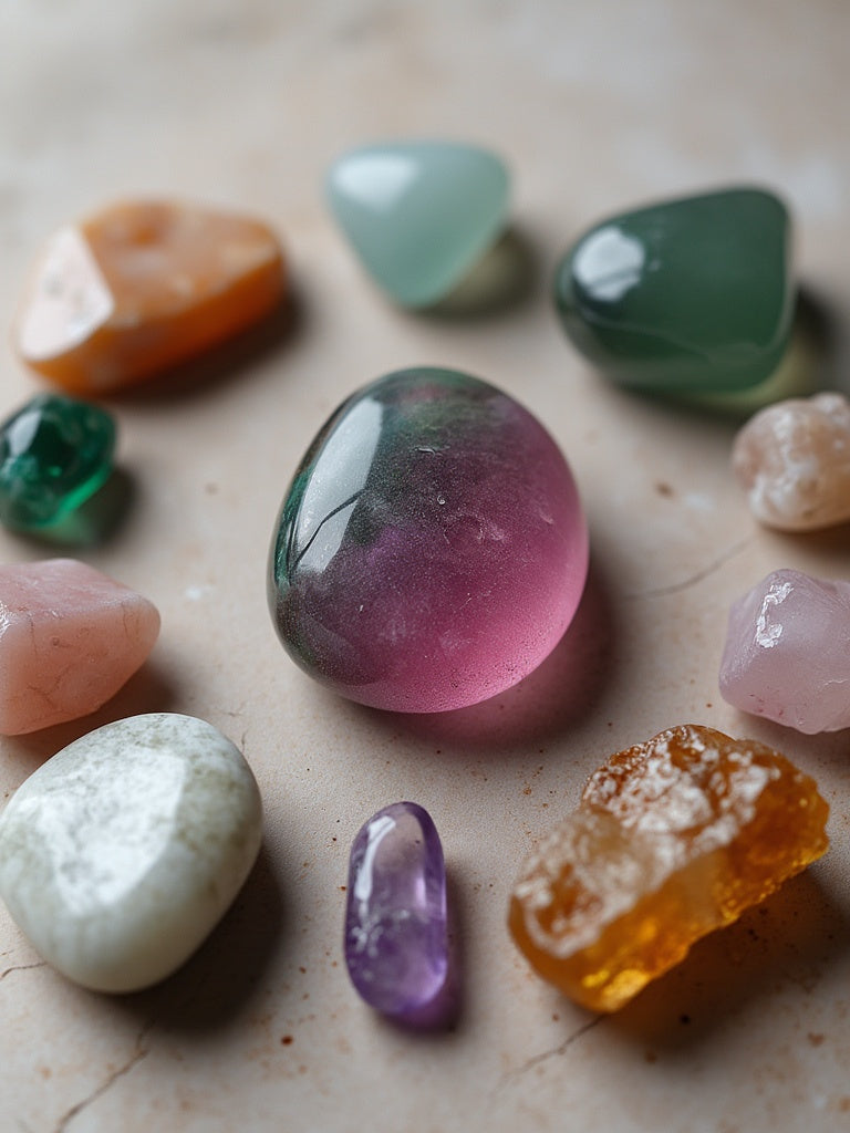Quartz rose, Améthyste, Obsidienne noire, Cristal de roche, Jade